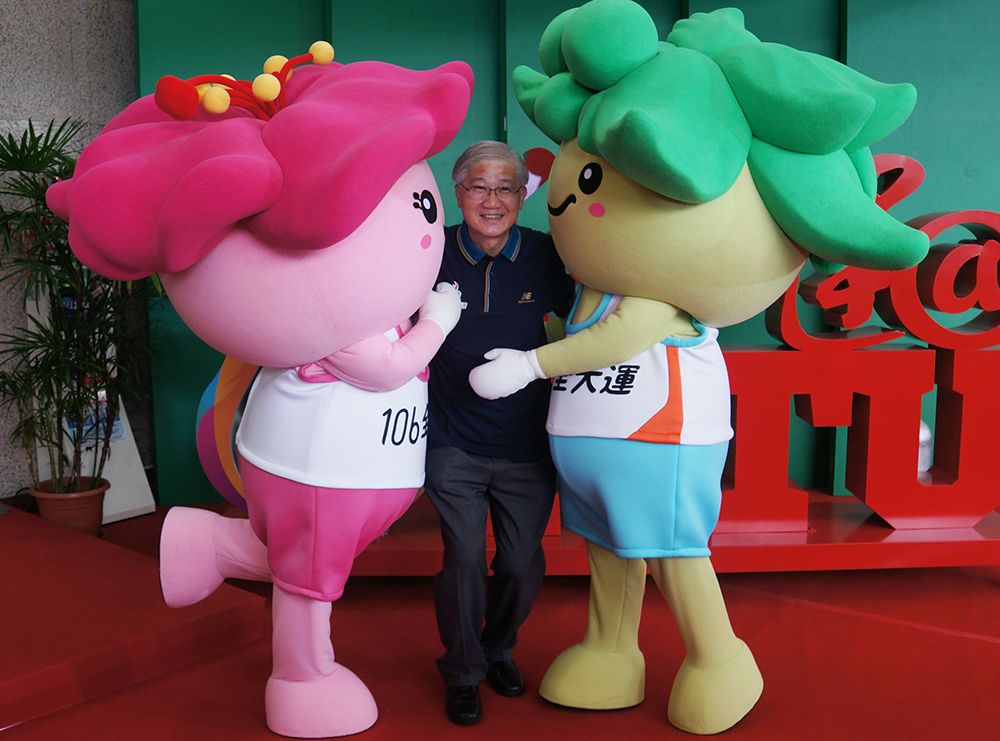 吉祥物「椰寶」與「鵑妹」與楊泮池校長合影。