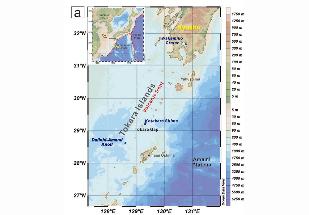 研究區域地圖,鹿兒島灣內Wakamiko Crater和吐噶喇列島(Tokara Islands),圖中藍色圓點為採樣點。