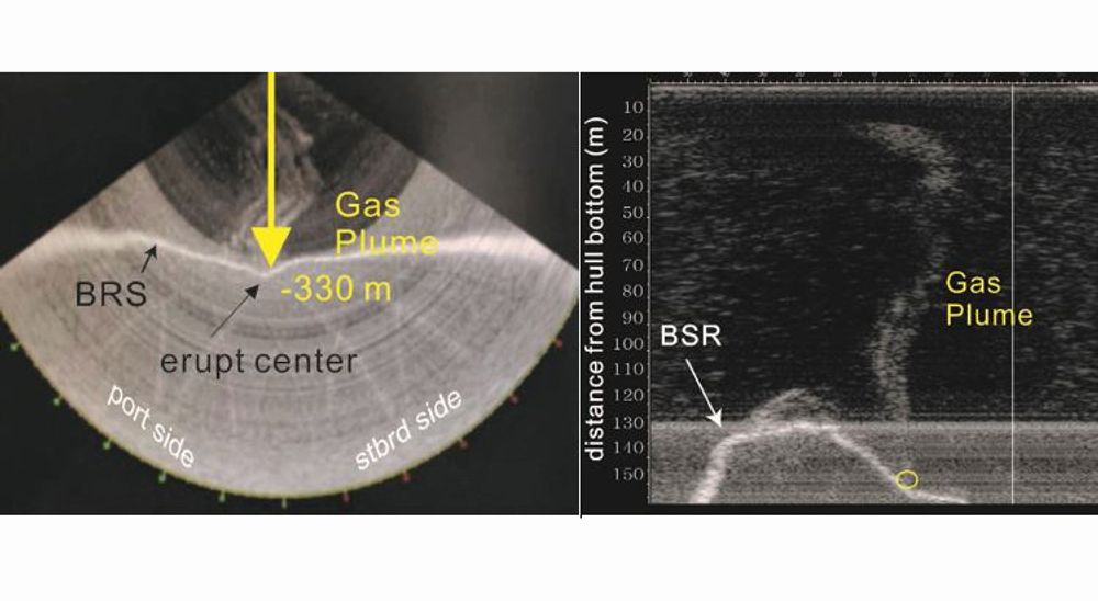 水柱反射影像圖(water column image)清楚顯示熱液噴氣(gas plume),拍攝地點:左圖為Daiichi-Amami Knoll,右圖是Kotakara Shima。