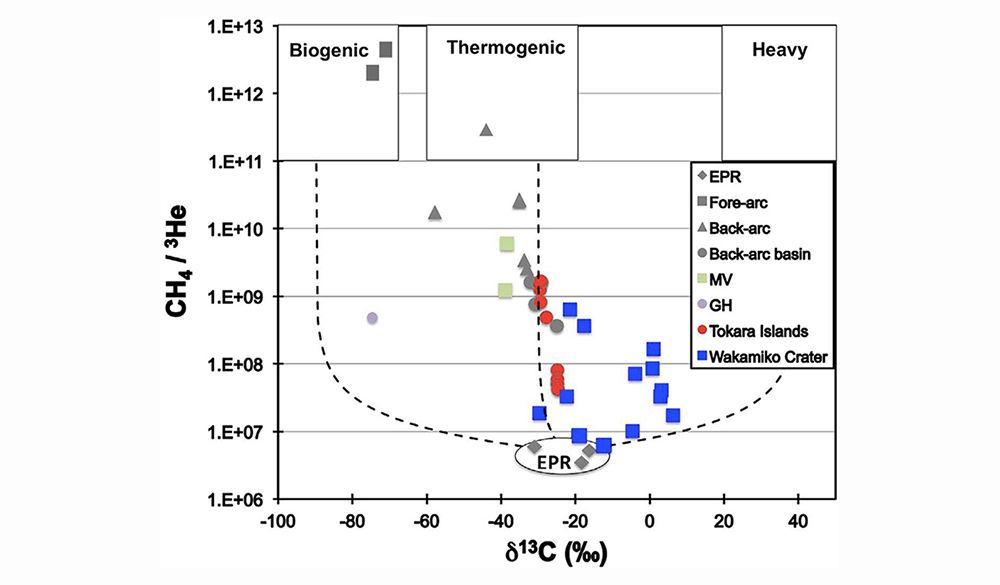 熱水樣本中甲烷碳同位素與甲烷與氦氣的濃度比值(CH4/3He)關係圖。在吐噶喇列島地區的甲烷主要是受到熱分解而產生,而在鹿兒島灣Wakamiko Crater主要是以非生物來源的甲烷受到微生物氧化消耗較輕的甲烷,故具有較重的碳同位素。
