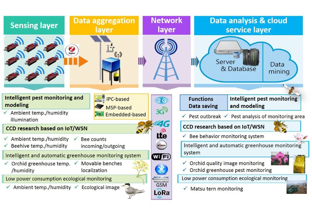 考量農業田間資訊監控的需求變異性與監控對象的多樣性,利用機電整合技術致力於結合前瞻的資通訊/無線感測器網路(ICT/WSN)技術與物聯網(IoT)技術,以模組化設計為核心技術發展模式,進行田間遠距無線監控系統的創新設計,開發出「前瞻IoT/WSN資通訊監控平臺」。此平臺由「感知層」、「資料匯集層」、「網路層」與「資料分析層」等不同面向之技術所整合而成,適用於各類監控應用,如圖1所示。前端的感知層係由平臺最前線―無線感測器網路所組成,依監測項目之需求可組合不同的感測器模組並搭載無線通訊晶片,可大量地感測田間原始資料。值得一提的是,依照農業害蟲的獨特性,江教授的研究團隊亦開發出東方果實蠅、斜紋夜蛾、穀蠹等重要農業害蟲的專屬感測器。由於採取模組化設計,此平臺亦可依照不同之研究面向或監測需求,將此項平臺之感知層的觸角延伸至智慧農業、生態環境與智慧電網廣域量測等應用領域。資料匯集層負責如何安排各感測器有秩序且快速地回傳資料,研究團隊進行包括避免封包碰撞、有效分配路由與延長網路壽命等核心軟體技術的開發。目前已開發出適應於各種場域環境限制之不同類型的資料匯集技術與硬體系統,包括工業電腦、單晶片系統、以及嵌入式系統三大類資料匯集閘道器系統。此平臺的網路層擔任將前端感測區域之感測資料回傳至資料分析層之間的媒介,研究團隊已依不同傳輸距離(長則跨縣市,短則臥房內)開發並整合市面上常見之通訊協定(GSM、4G、Wi-Fi、ZigBee、藍牙與LoRa等)。此項「IoT/WSN資通訊監測平臺」的後端為資料分析層,也已發展出不同資料型態的儲存與礦掘技術,分別針對不同類型之感測資料擷取可用之資訊,建立資料分析模型提供資料分析與預測之服務。目前已將所開發之「前瞻IoT/WSN資通訊監控平臺」應用到智慧型害蟲監測網與害蟲生態模型分析、蜂群衰竭失調症候群、稀有鳥類生態影像監測系統與智慧型自動化蘭園生長監控系統等,為我國農業科技打造出「智慧農業」之基礎框架。
