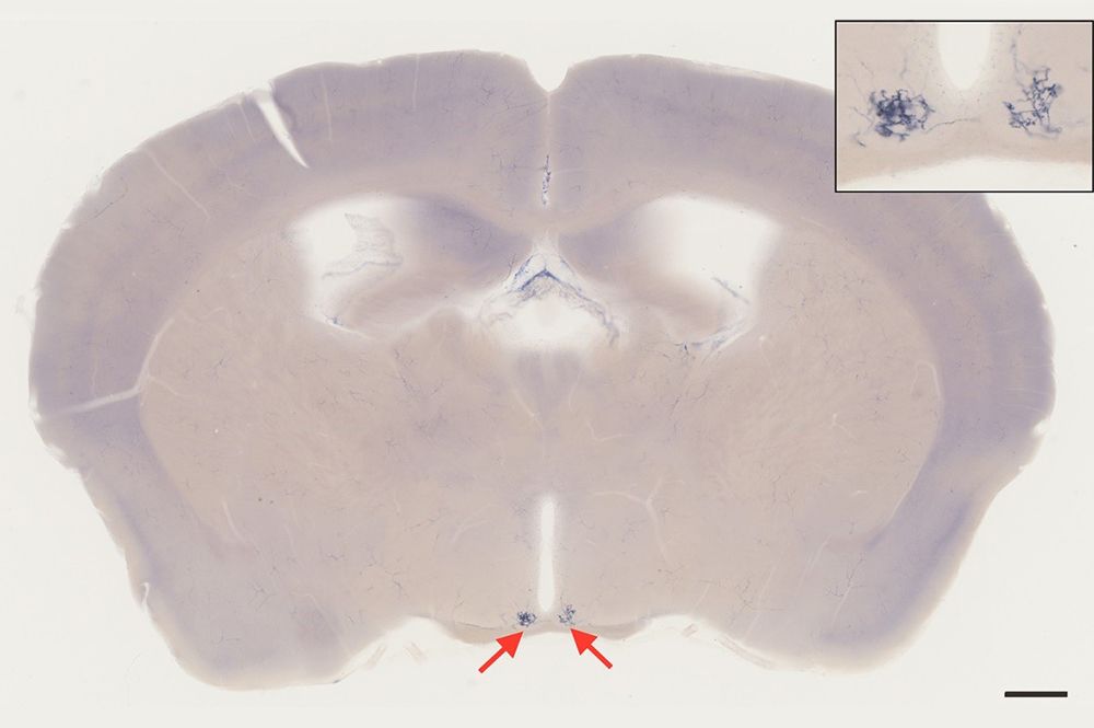 生命科學系陳示國老師研究:整個小鼠腦中僅標定一顆神經細胞,其神經軸突同時並且直接連結左右腦之視交叉上核(紅色箭頭),協助同步生理時鐘。