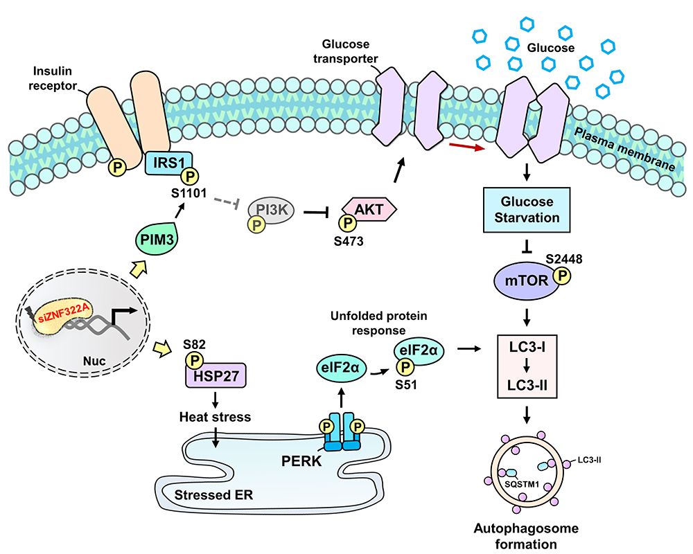 二、阮老師團隊運用定量蛋白體以及磷酸化蛋白體技術發現,ZNF322A基因沉默後促進PIM3的轉錄調節,影響IRS1在Serine 1101的磷酸化,進而透過PI3K/AKT/mTOR訊息路徑操控葡萄糖的吸收。除此之外,ZNF322A基因沉默後會透過影響HSP27 S82 and eIF2a S51的磷酸化而造成非折疊蛋白反應,進一步形成自噬小體。這個研究的結果或許可以提供肺癌治療的策略。此成果發表於《生醫科學雜誌》(Journal of Biomedical Science) (DOI: 10.1186/s12929-020-00668-5)。