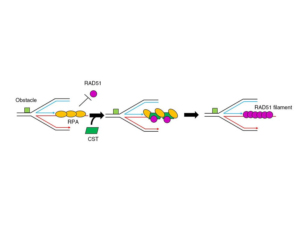 圖二、 此模型闡釋CST如何通過(l)其與和RAD51 蛋白的彼此結合,及(2)和RPA共存的特性,來協助RAD51能在反轉複製叉上形成核蛋白絲,促進DNA複製修復。
