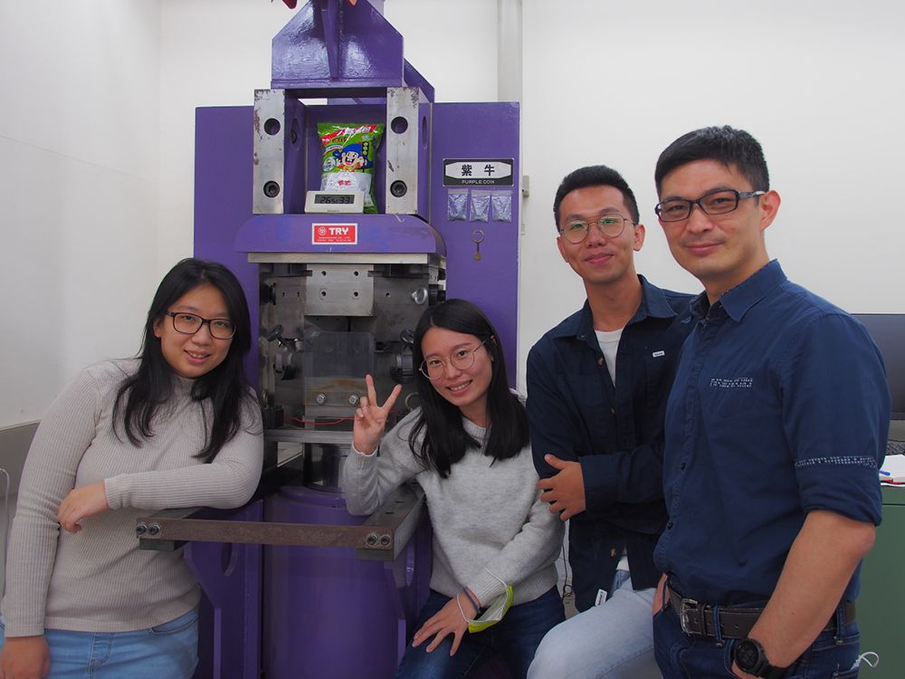 高壓先端材料研究團隊:(自右)主持人陳威廷、鄭慶嘉、洪紫媚、劉恩沛,以及DIA式超高壓高溫合成設施:紫牛。