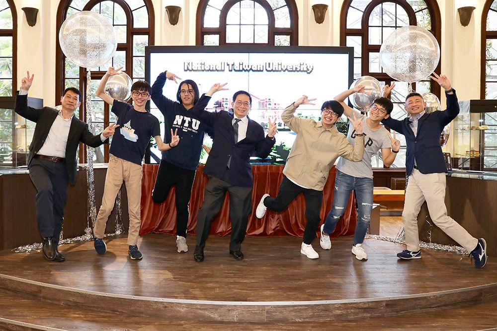 圖左至右分別為資工系學生周奕勳、昆蟲系學生汪經倫、校長管中閔、工科海洋系學生張博皓、資管系學生方譽霖以及副教務長詹魁元。